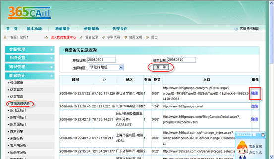 掌握真實有效的流量、咨詢量數(shù)據(jù),記錄流量和咨詢量數(shù)據(jù)及相互關(guān)系,為企業(yè)營銷提供參考數(shù)據(jù)。 頁面訪問記錄查詢: 登陸kf000在線客服系統(tǒng)網(wǎng)站,點擊“數(shù)據(jù)統(tǒng)計”->“頁面訪問記錄”,可選擇時間段,點擊“查詢”按鈕進行查詢: