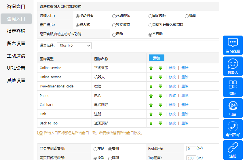 訪客可在客服休息時間或忙碌未及時回復(fù)時將自己的聯(lián)系方式留下,等待客服回呼解決問題,可在“系統(tǒng)設(shè)置-媒體對接-網(wǎng)頁(網(wǎng)站)-設(shè)置-咨詢?nèi)肟凇?/span>
